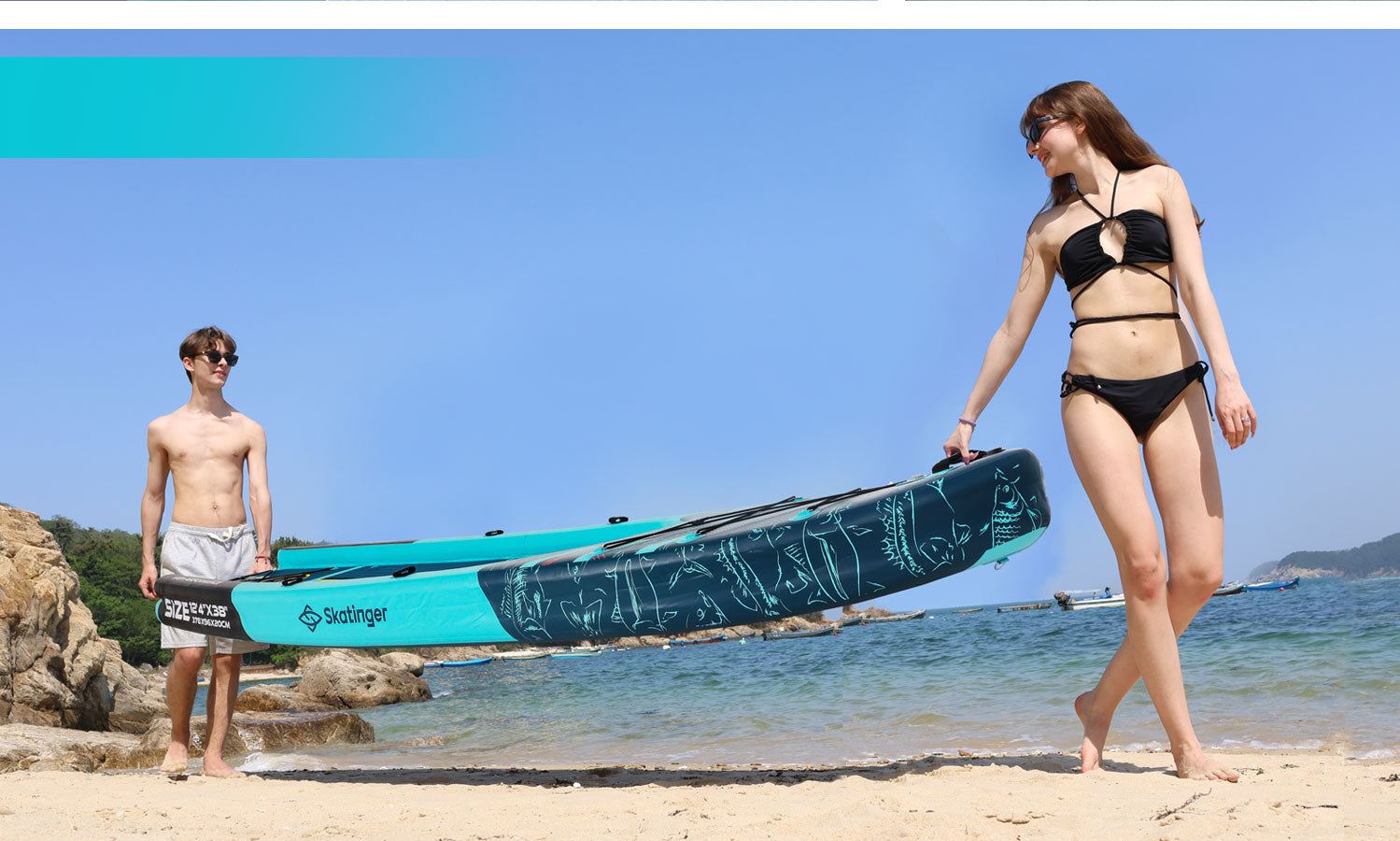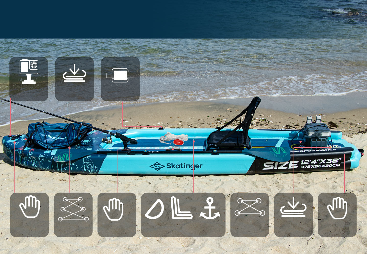 Designed for passionate anglers, this inflatable platform offers everything you need for a successful day on the lake or river. With its generous size of 378 × 96 × 20 cm, reinforced 2900GSM drop-stitch PVC, and smart mounting options, it's more than a board – it’s your floating fishing base. Whether you're casting lines, paddling to your favorite spot, or just relaxing, the SKATINGER Fishing Boat keeps you steady, dry, and ready.