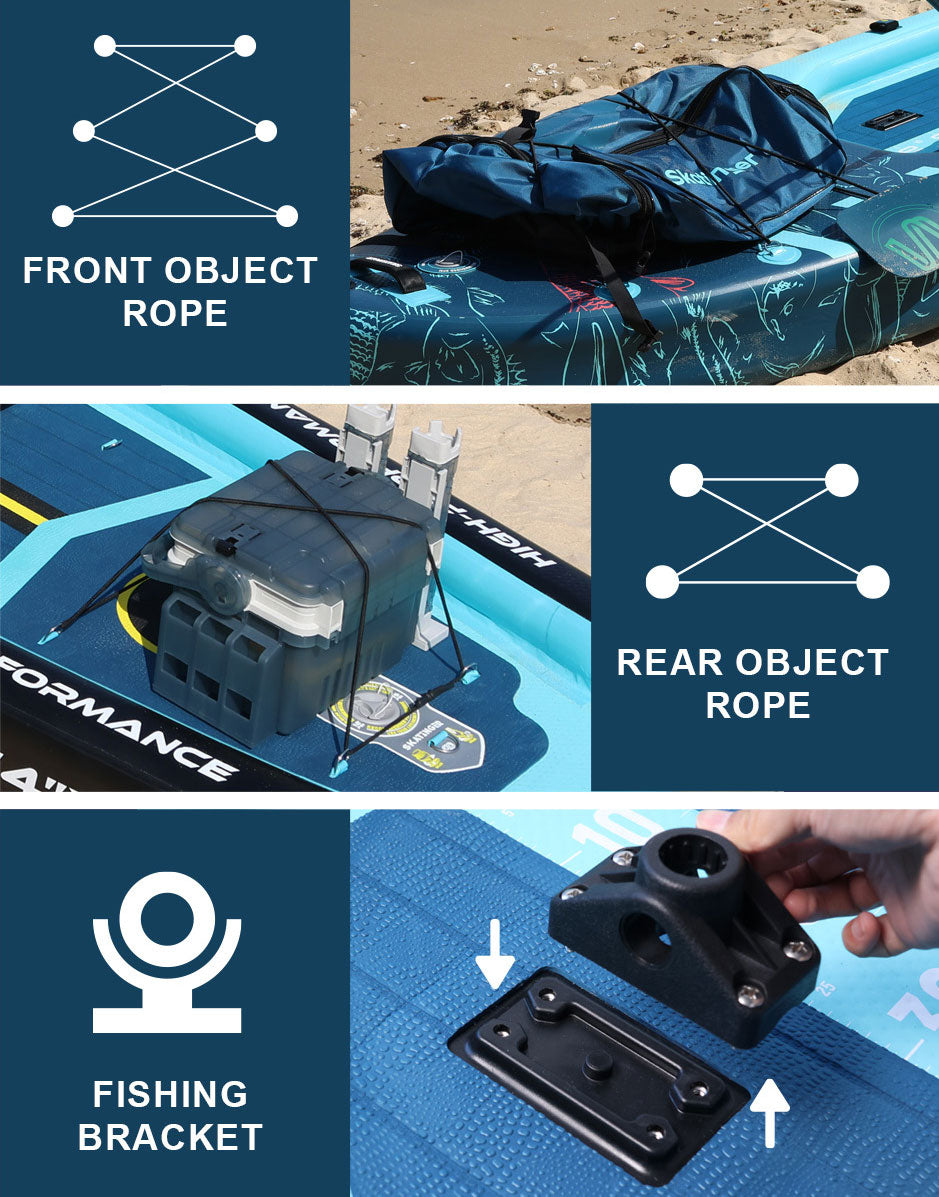 🔸 Full accessories (typical set): paddle, single US box fin, leash, pump, repair kit, dry bag/backpack/phone sac, seating, anchor